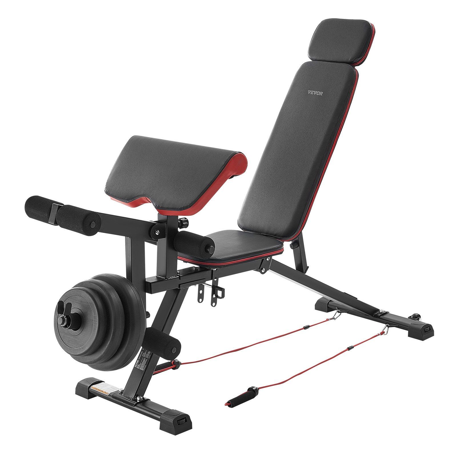This strength training bench includes a removable leg extension and a 19-inch extra-wide preacher pad. The preacher pad is adjustable with 5 positions, and the double-leg rest structure is compatible with 3-4 weight plates (1/2-inch dumbbell rod).