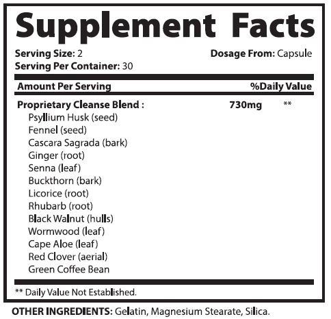 Advanced Cleansing Formula: Made with the finest herbs, fibers and probiotics including Cascara Sagrada, Senna Leaf & Psyllium Husk. Includes 60 capsules (1-2 per day) optimized for an effective cleanse and detox.A Bowel Cleanse for Overall Health: The gut plays a vital role in overall health and your immune system. Use a colon detox in conjunction with a healthy lifestyle to support digestive function and increase absorption of essential nutrients.Premium Quality for 100% Satisfaction: Our colon cleanser supplements are made by vitamin experts in a facility that follows GMP (Good Manufacturing Process) guidelines. Caution: May cause bloating, cramping- see potential side effects in the safety warnings below.A Better You Starts Here: Our mission is to encourage people to become the best version of themselves; whether you're looking for improved digestive health, an energy boost or gut detox, we have a nutritional supplement or daily vitamin to help you get there.