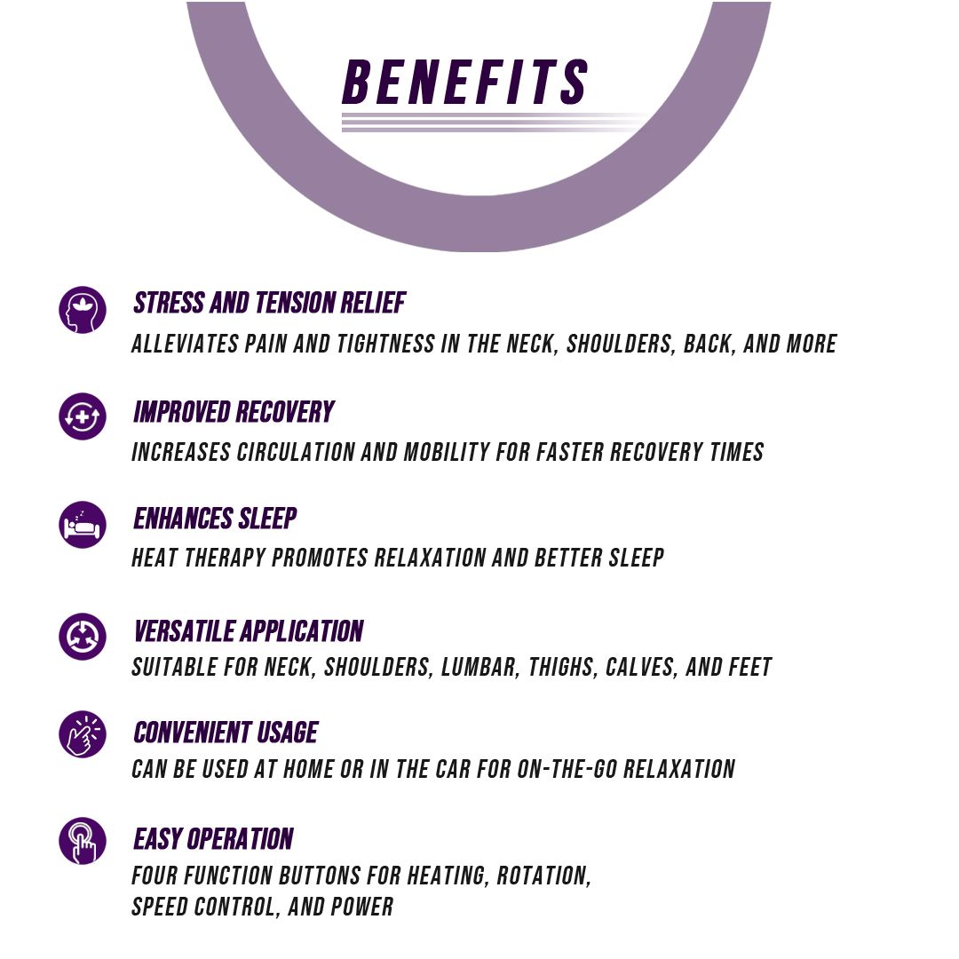 <p>Our Shiatsu Neck Massager also features infrared heat therapy, which helps to warm up your muscles and enhance blood flow. With a powerful motor reaching speeds of up to 3000 RPM, this massager delivers deep tissue massage that promotes relaxation and reduces tightness.</p>