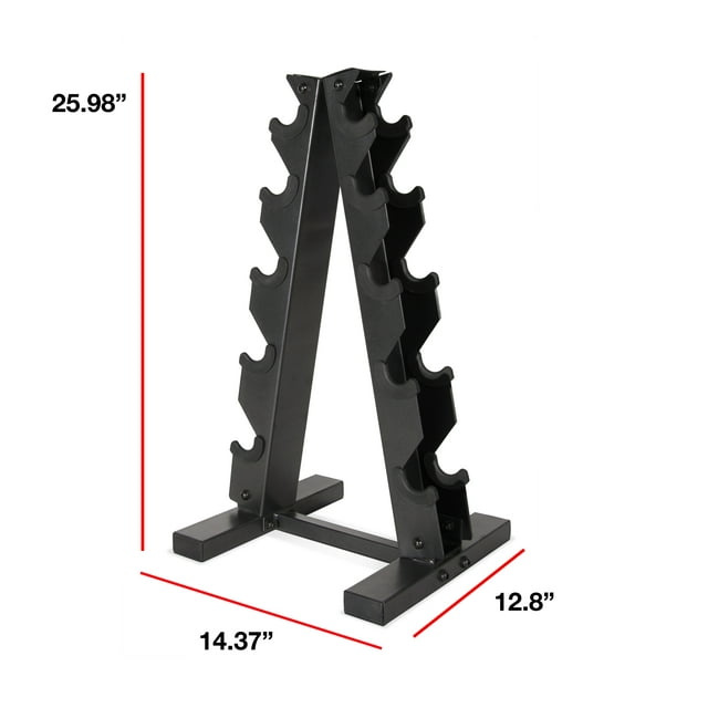 The  Black A-Frame Dumbbell Rack helps you organize your gym equipment and keep the floor clear. It features a staggered design with five levels on each side that allow for easy access and management. The rack is compatible with any hex or coated hex dumbbell weighing 5 to 25 lbs. It can support a maximum of 200 lbs. This compact dumbbell rack is sized just right to easily fit in cramped spaces, so it doesn't take up much room. Its quality construction will provide long-term durability. By holding your weights right where you need them, the F dumbbell rack Barbell makes your workouts more efficient and organized.