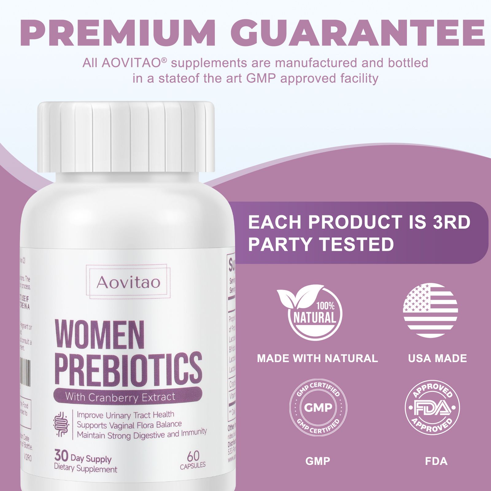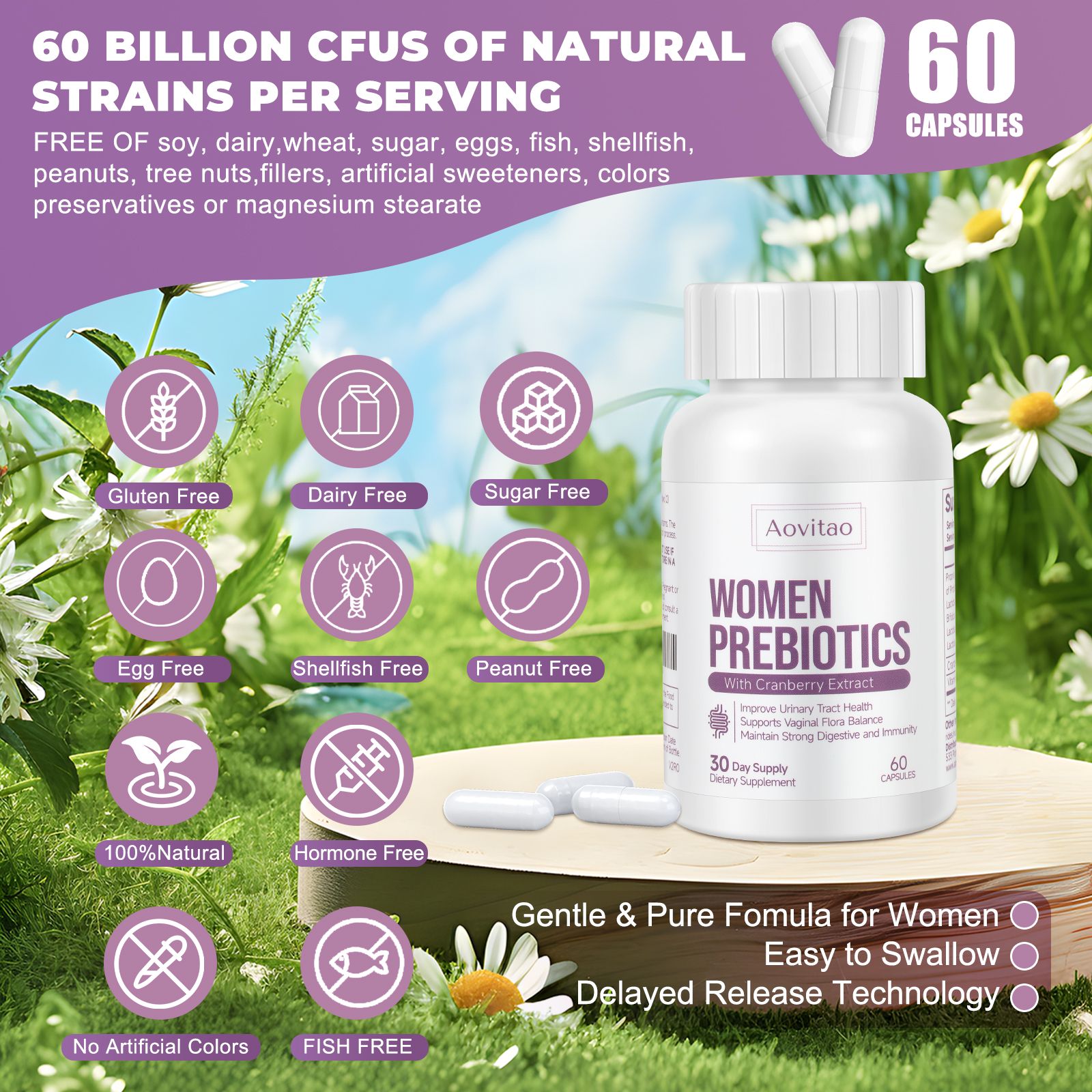 1.AOVITAO Women's Probiotic contains 60 billion CFUs per serving. More CFUs and Cranberry strains help quickly restore digestive and women's health.